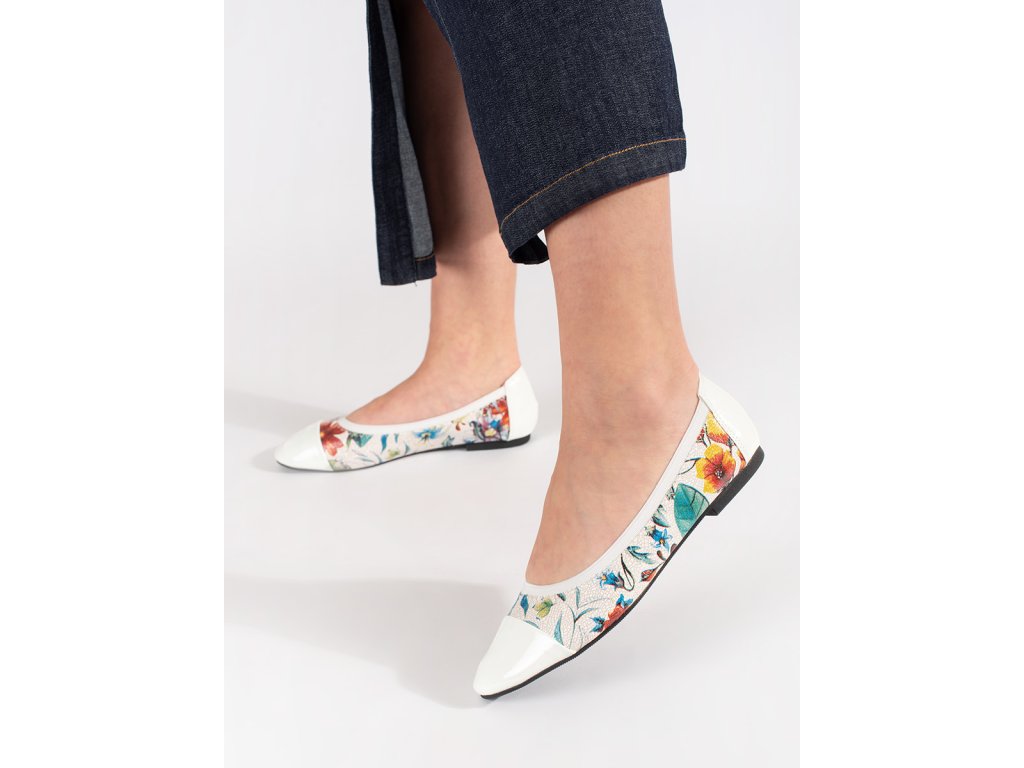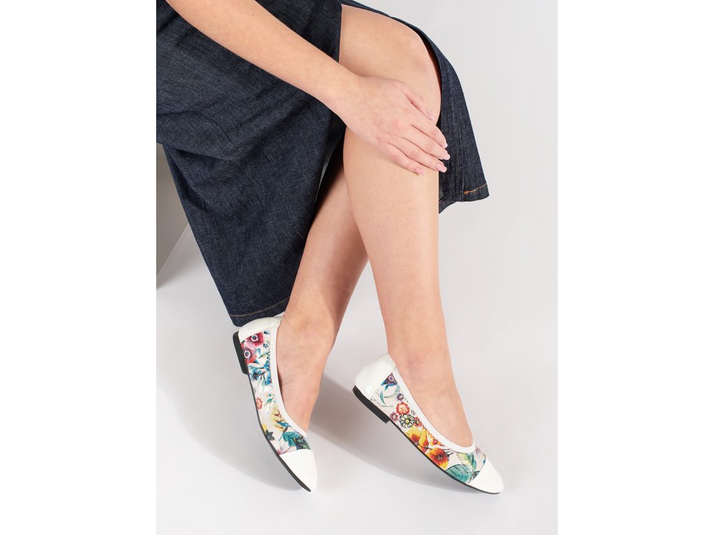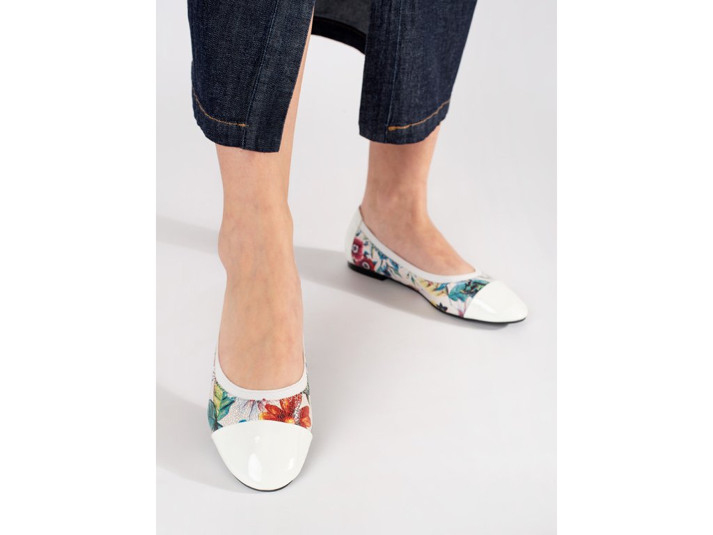 Baleríny s květinovým vzorem a lakovanou bílou špičkou