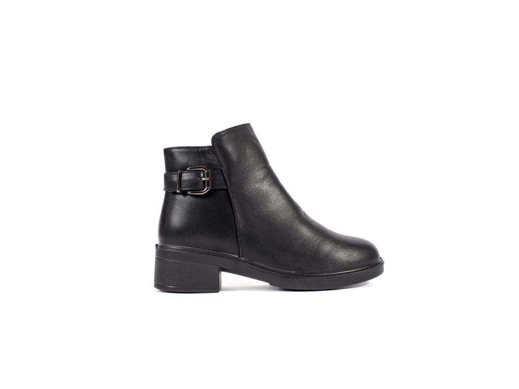 Černé dámské kotníkové boty na nízkém podpatku s ozdobnou přezkou