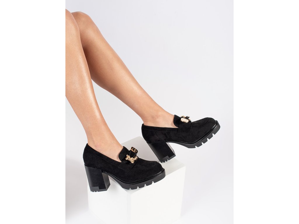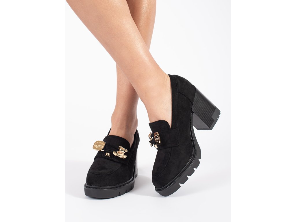 Černé dámské semišové polobotky na podpatku s kovovou ozdobou