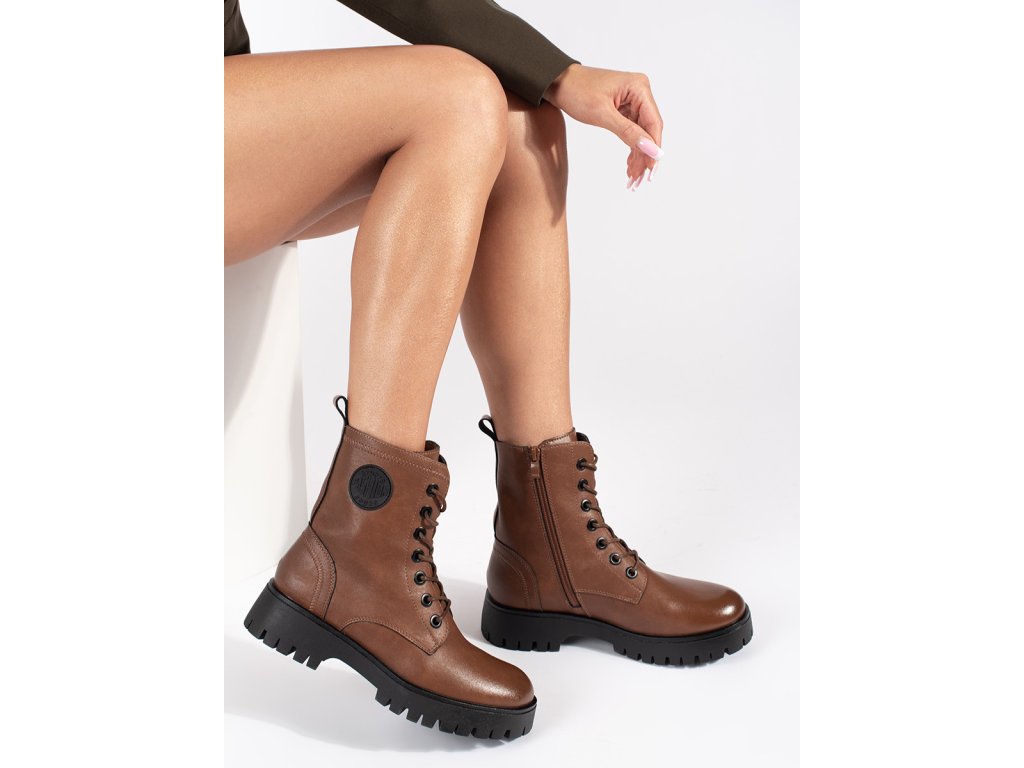 Hnědé šněrovací kožené dámské kotníkové boty na platformě Sergio Leone